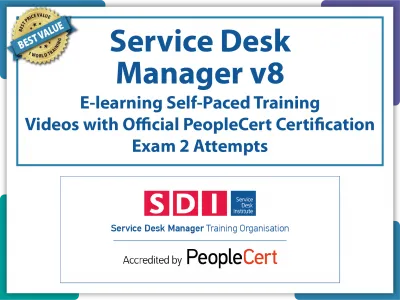 Service Desk Manager v8 (SDM) E-learning Self-paced Training Videos with Official PeopleCert Certification Exam 2 Attempts. Course code: SDMV8-E-2